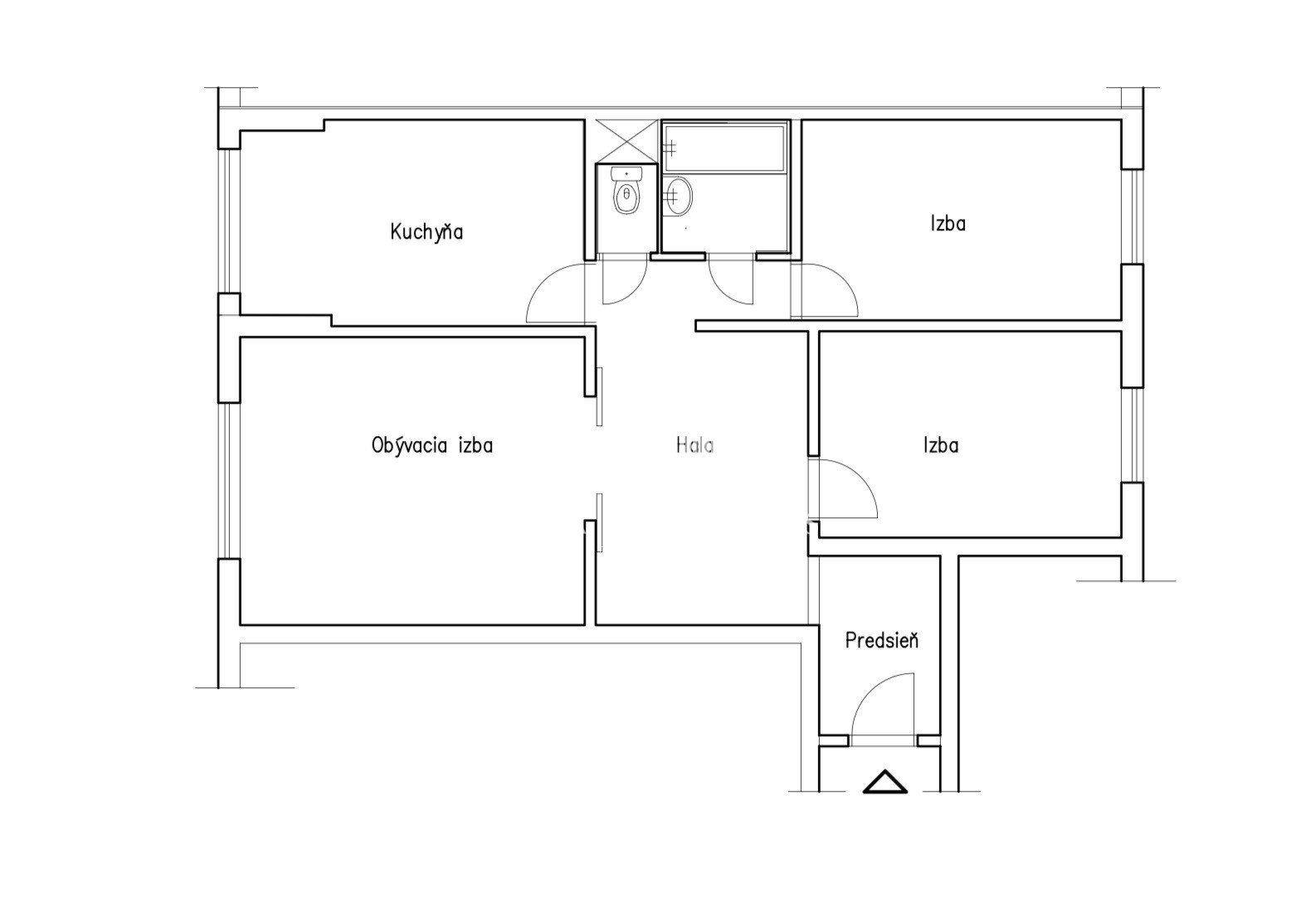 chodba, hala, spálňa, detská izba, obývačka, kuchyňa – rozšírená o pôvodnú loggiu (ktorá sa dá v prípade potreby dorobiť), WC, kúpeľňa
